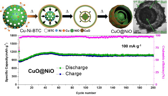 1)设计合成了新颖的三层的氧化镍/氧化钴多孔核壳结构,利用不同组分在不同电压平台下顺序充放电以及丰富的大中孔结构,有效改善了电极材料储锂时的体积膨胀,提高了电极结构的稳定性。使用该电极材料的半电池其在200圈后的储锂容量基本没有衰减,仍然高达1061 mAh/g,约为商业锂电池负极的3倍以上,上述研究成果近日以上大为第一单位发表于学术期刊ACS Nano(影响因子为12.8)上,论文的第一作者是研究生郭文翔同学。