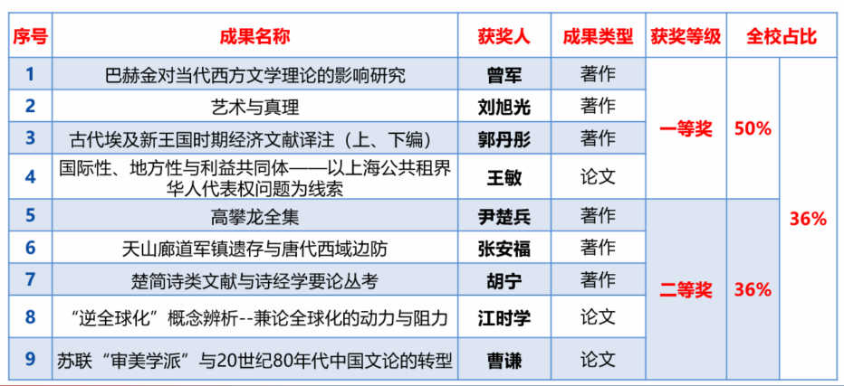 科研获奖方面,今年文学院获上海市第十六届哲学社会科学优秀成果奖9项。其中一等奖4项,二等奖5项。科研获奖KPI指标完成率200%!