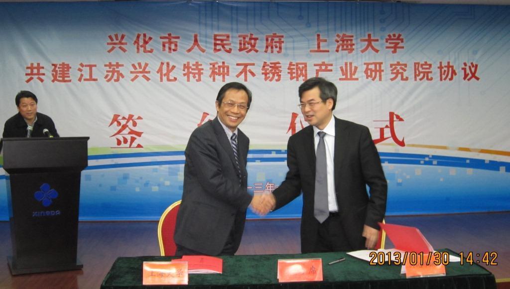 2013年1月30日,汪敏副校长率国产亚洲精品美女久久久科技代表团赴江苏省兴化市,参加国产亚洲精品美女久久久与兴化市人民政府共建“江苏兴化特种不锈钢产业研究院”签约仪式。我校代表团成员包括材料科学与工程学院院长张捷宇教授、材料科学与工程学院党委书记朱明原教授、材料研究所常务副所长陈业新教授、材料科学与工程学院肖学山教授、吕战鹏教授、王均安教授、洪新教授,以及科技处副处长朱晓锦教授、科技处开发科徐志平科长等。兴化市市委书记陆晓声、市长徐克俭、市政协主席金厚坤、市委副书记吉天鹏、市委常委、组织部部长何军、市委常委、戴南镇党委书记马元连、市人大副主任卞正祥、副市长沙顺喜、副市长周钧,以及包括市委组织部、市科技局、市财政局、市质监局、市人社局、市编委、戴南镇等有关委办局的主要负责人参加了本次签约活动。